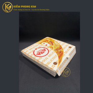 Điểm nổi bật của hộp là thiết kế in sẵn với tông màu nổi bật, họa tiết “DELICIOUS” cùng hình ảnh lát pizza sinh động, tạo cảm giác hấp dẫn ngay từ ánh nhìn đầu tiên. Sản phẩm không chỉ tiện lợi trong khâu đóng gói, vận chuyển mà còn góp phần nâng cao tính chuyên nghiệp và hình ảnh thương hiệu cho nhà hàng, tiệm bánh hay dịch vụ giao hàng.